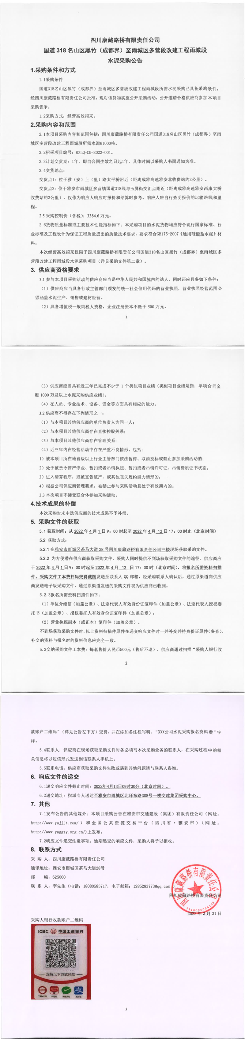 四川康藏路橋有限責(zé)任公司國道318名山區(qū)黑竹(成都界)至雨城區(qū)多營段改建工程雨城段水泥采購公告
