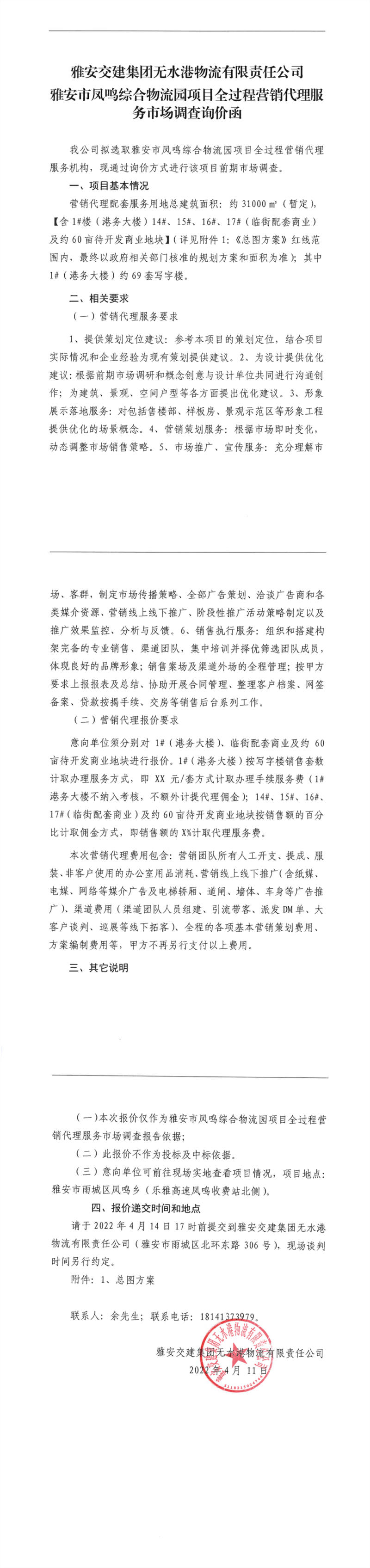 雅安交建集團無水港物流有限責任公司雅安市鳳鳴綜合物流園項目全過程營銷代理服務市場調查詢價函