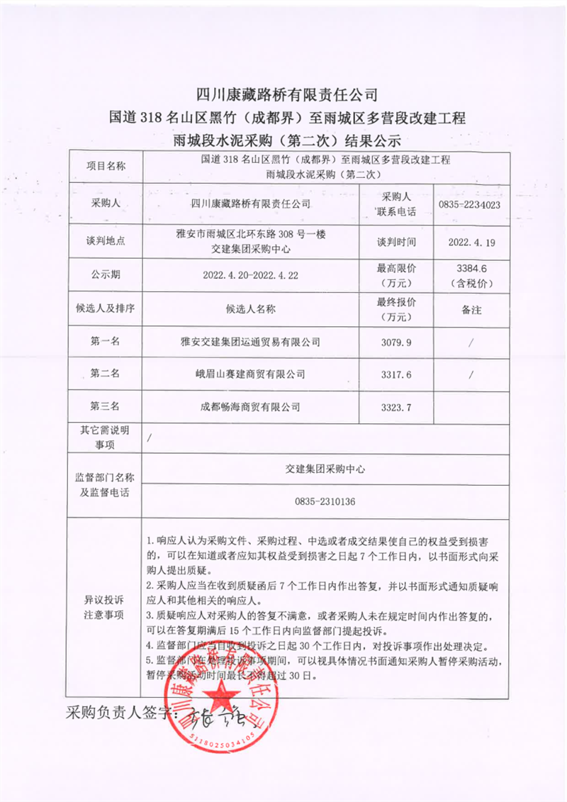 四川康藏路橋有限責(zé)任公司國(guó)道318名山區(qū)黑竹(成都界)至雨城區(qū)多營(yíng)段改建工程雨城段水泥采購(gòu)(第二次)結(jié)果公示