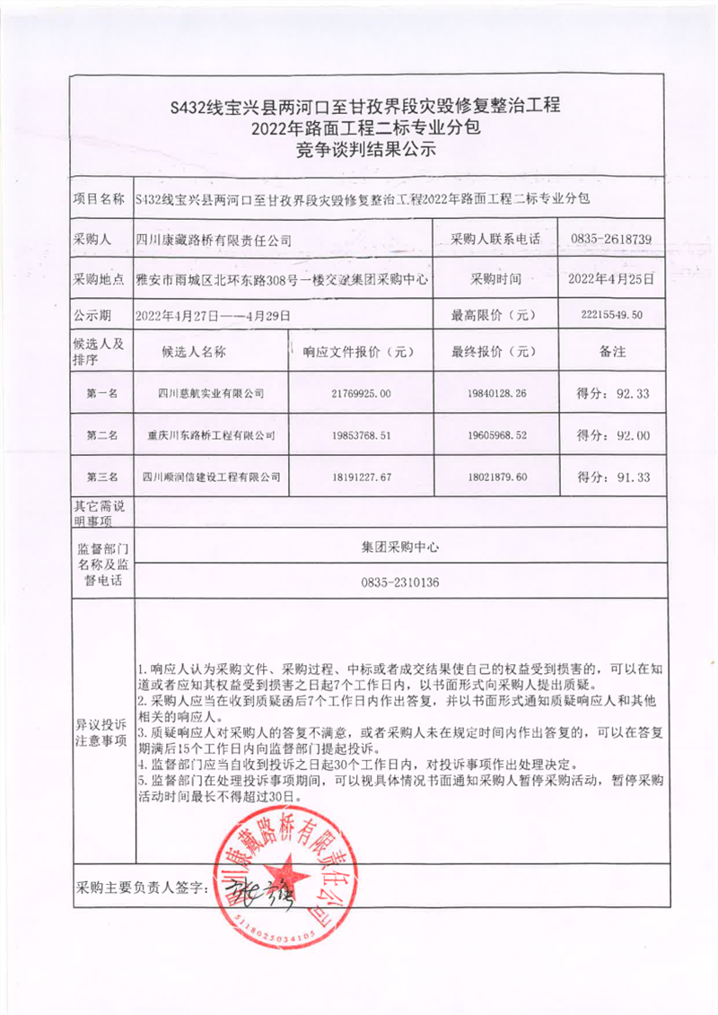 四川康藏路橋有限責(zé)任公司S432線寶興縣兩河口至甘孜界段災(zāi)毀修復(fù)整治工程2022年路面工程二標(biāo)專業(yè)分包競爭談判結(jié)果公示