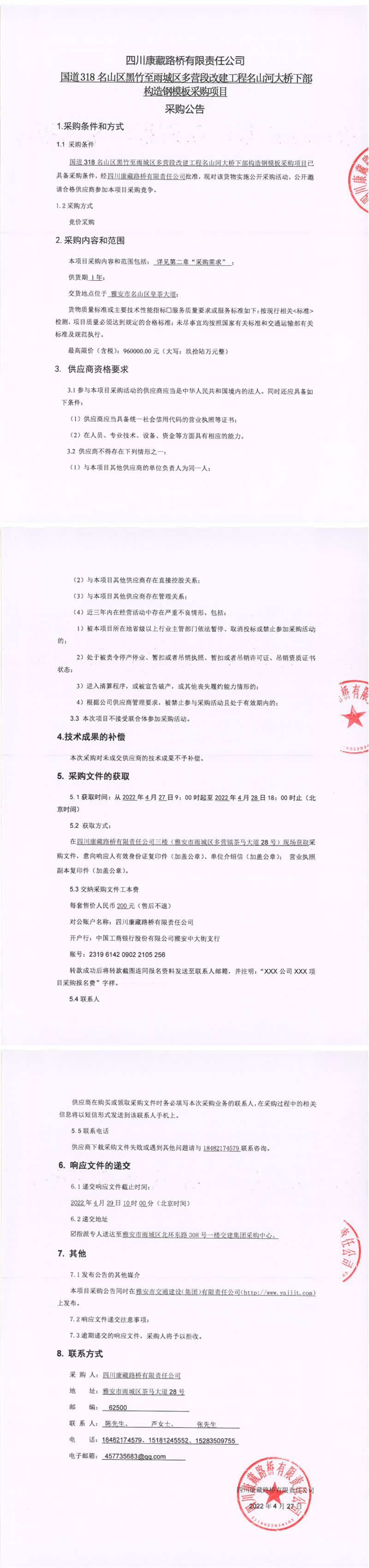 四川康藏路橋有限責(zé)任公司國道318名山區(qū)黑竹至雨城區(qū)多營段改建工程名山河大橋下部構(gòu)造鋼模板采購項(xiàng)目采購公告