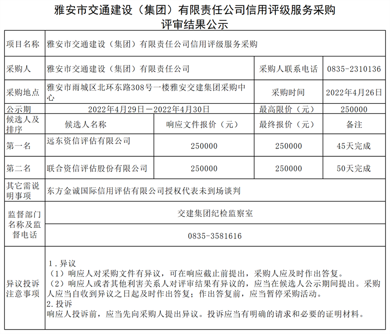 雅安市交通建設(shè)(集團(tuán))有限責(zé)任公司信用評(píng)級(jí)服務(wù)采購(gòu)評(píng)審結(jié)果公示