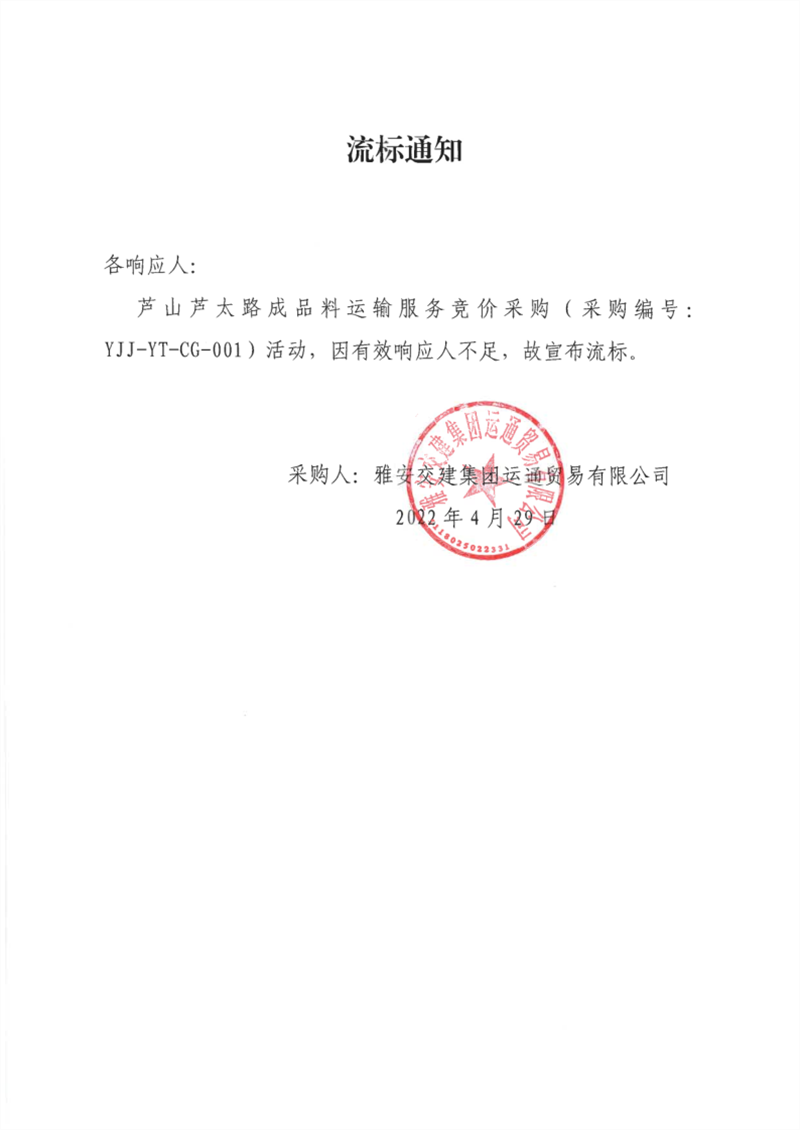 雅安交建集團運通貿(mào)易有限公司蘆山蘆太路成品料運輸服務(wù)競價采購流標(biāo)通知