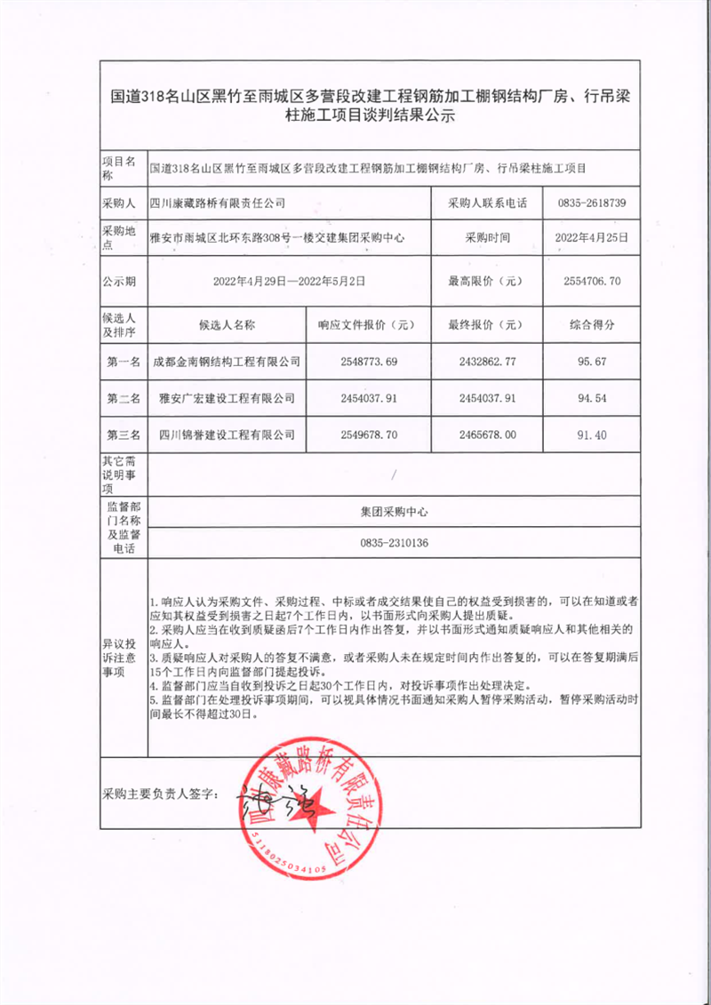 四川康藏路橋有限責(zé)任公司國(guó)道318名山區(qū)黑竹至雨城區(qū)多營(yíng)段改建工程鋼筋加工棚鋼結(jié)構(gòu)廠房、行吊梁柱施工項(xiàng)目談判結(jié)果公示