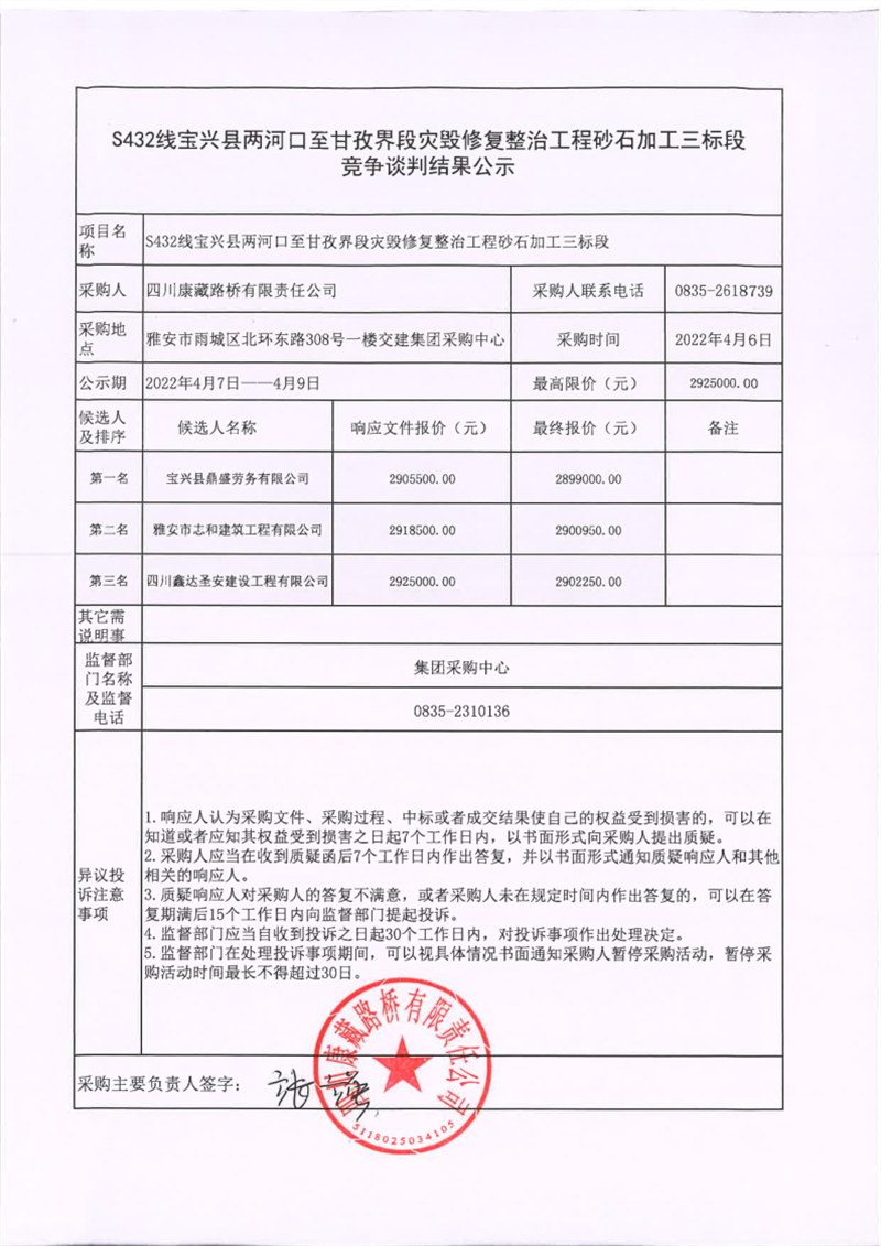 四川康藏路橋有限責任公司S432線寶興縣兩河口至甘孜界段災毀修復整治工程砂石加工三標段競爭談判結(jié)果公示