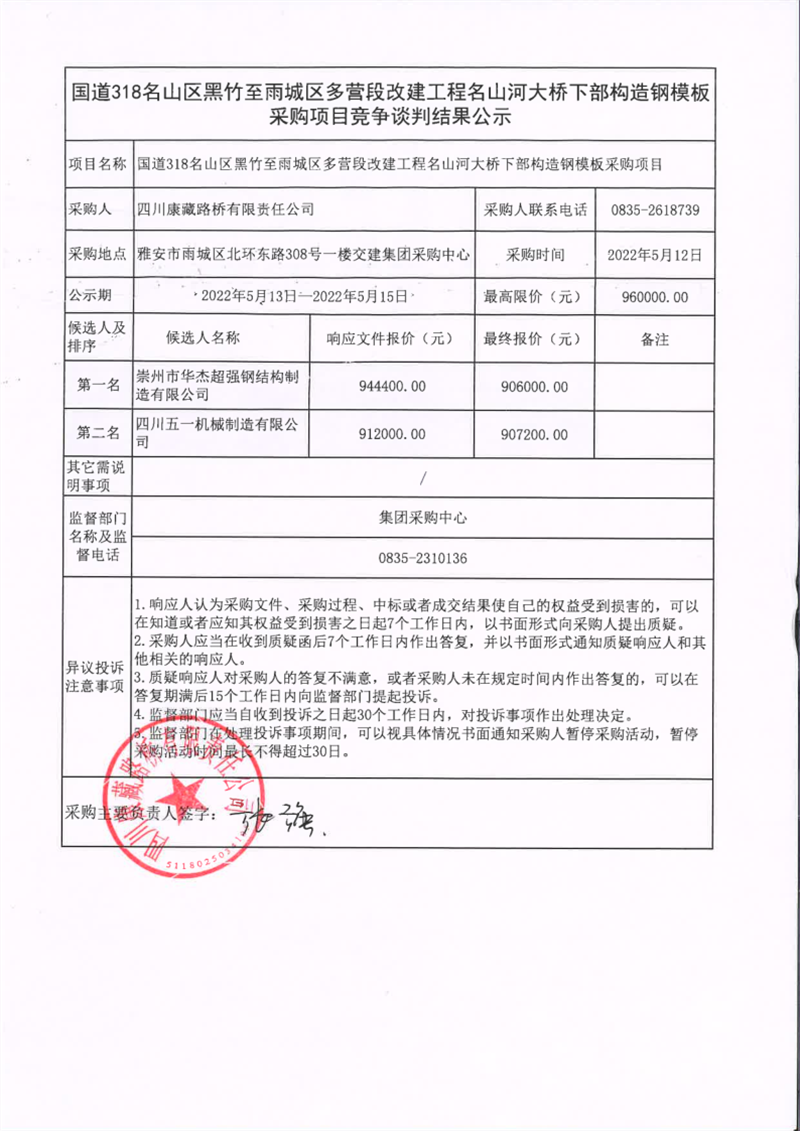 四川康藏路橋有限責(zé)任公司國道318名山區(qū)黑竹至雨城區(qū)多營段改建工程名山河大橋下部構(gòu)造鋼模板采購項目競爭談判結(jié)果公示