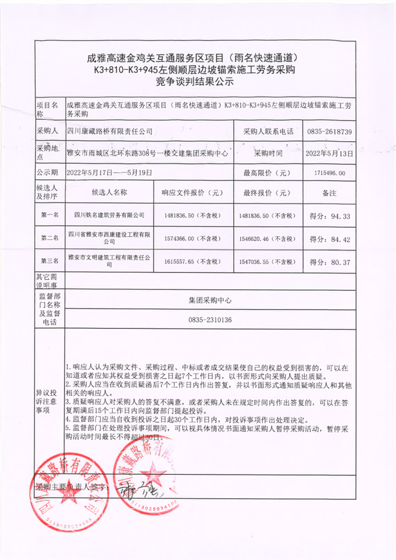 四川康藏路橋有限責(zé)任公司成雅高速金雞關(guān)互通服務(wù)區(qū)項(xiàng)目(雨名快速通道)K3+810-K3+945左側(cè)順層邊坡錨索施工勞務(wù)采購(gòu)競(jìng)爭(zhēng)談判結(jié)果公示