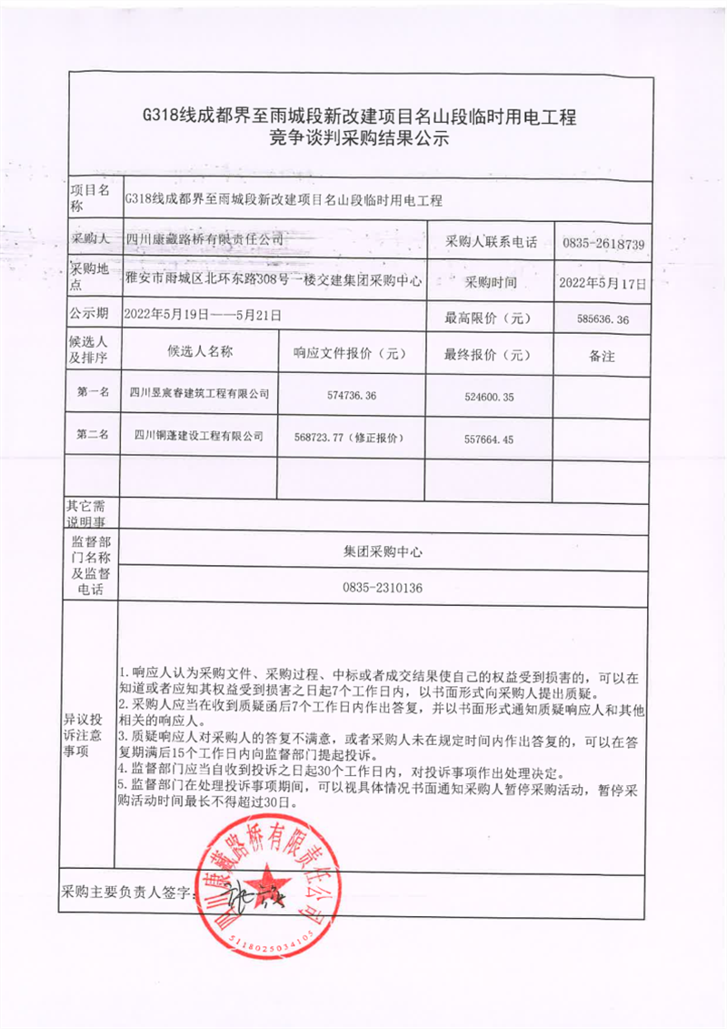 四川康藏路橋有限責任公司G318線成都界至雨城段新改建項目名山段臨時用電工程競爭談判采購結(jié)果公示