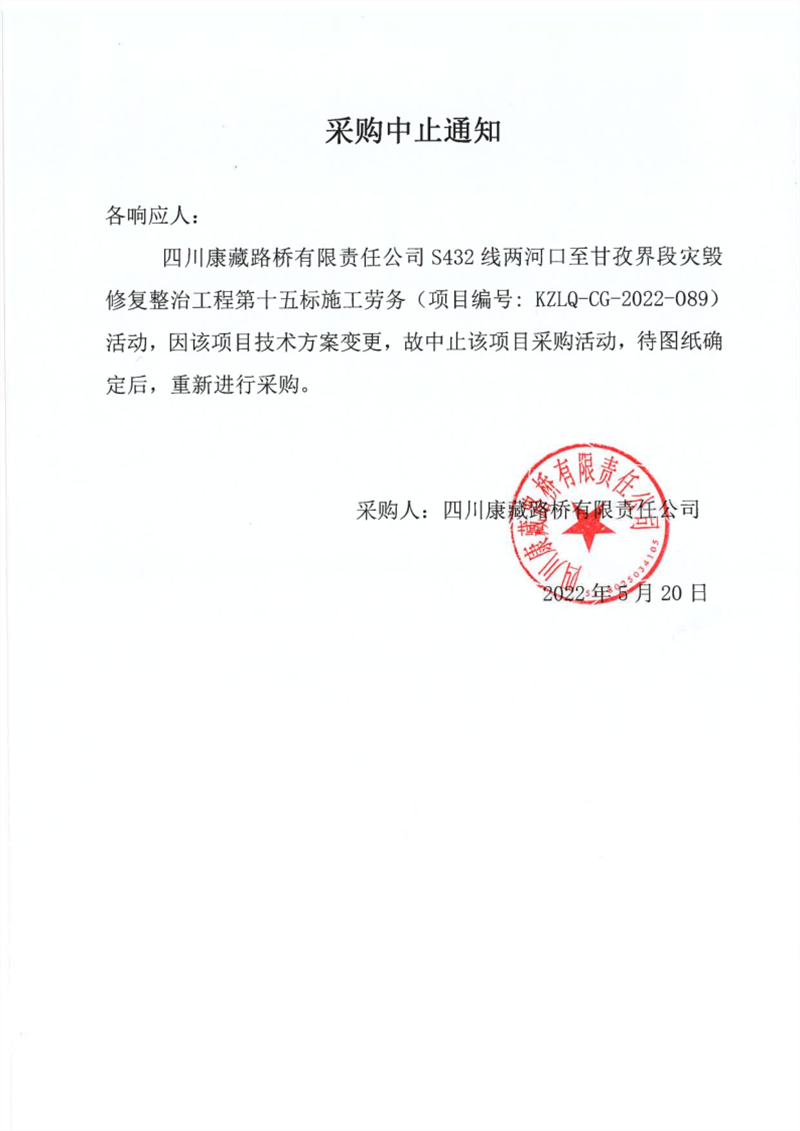 四川康藏路橋有限責(zé)任公司S432線(xiàn)寶興縣兩河口至甘孜界段災(zāi)毀修復(fù)整治工程第十五標(biāo)施工勞務(wù)采購(gòu)中止通知