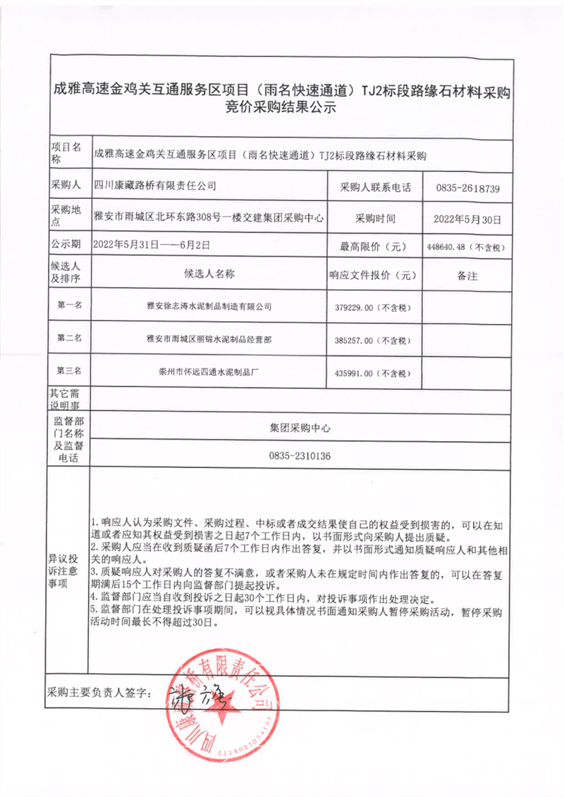 四川康藏路橋有限責任公司成雅高速金雞關互通服務區(qū)項目(雨名快速通道)TJ2標段路緣石材料采購競價采購結果公示