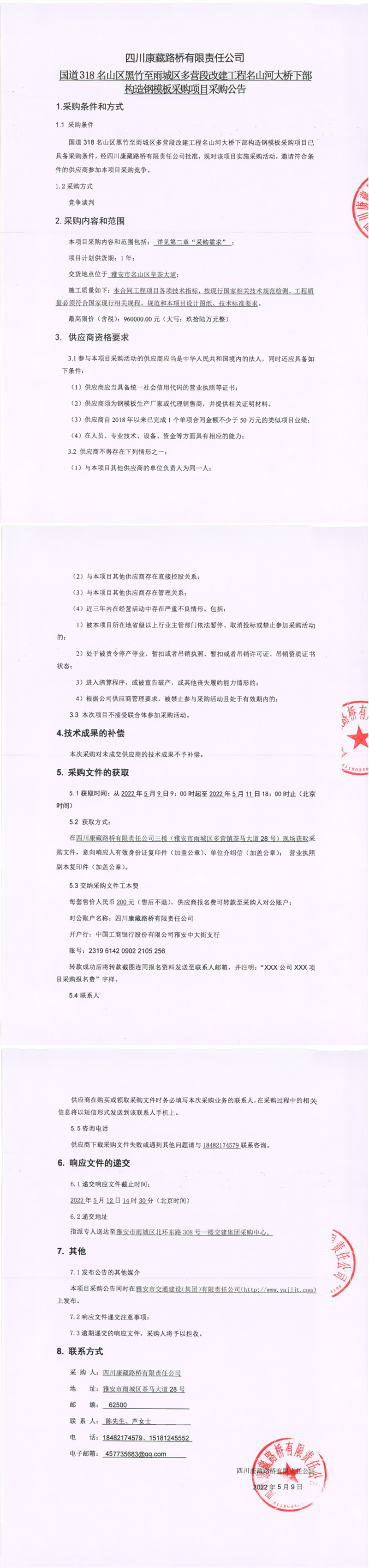 四川康藏路橋有限責(zé)任公司國(guó)道318名山區(qū)黑竹至雨城區(qū)多營(yíng)段改建工程名山河大橋下部構(gòu)造鋼模塊采購項(xiàng)目采購公告