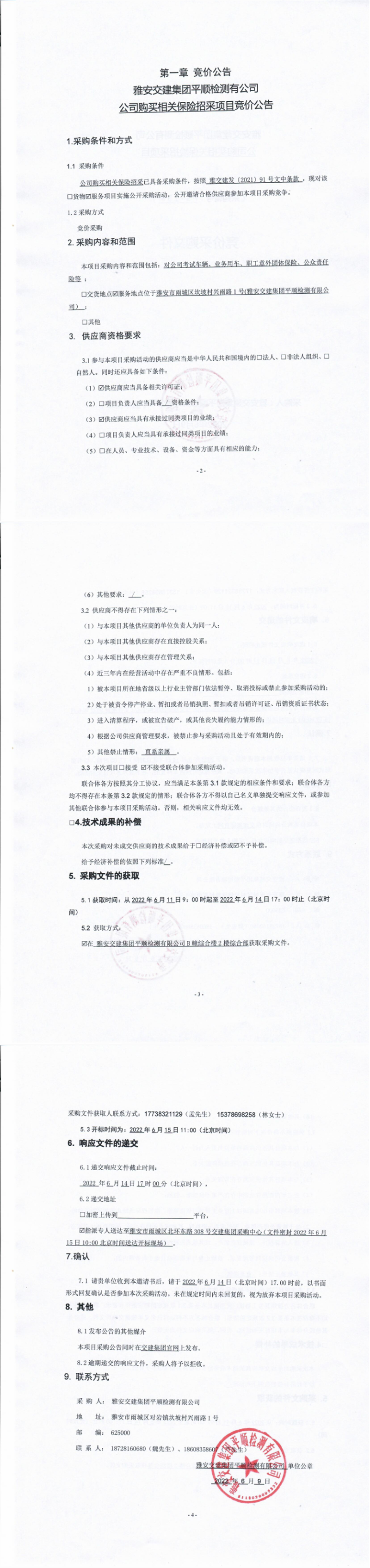 雅安交建集團(tuán)平順檢測有限公司公司購買相關(guān)保險招采項目競價公告