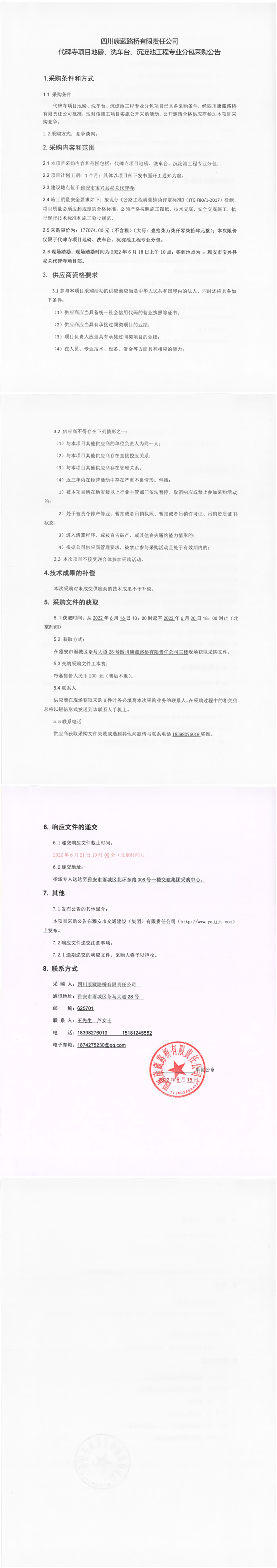 四川康藏路橋有限責(zé)任公司代碑寺項(xiàng)目地磅、洗車臺、沉淀池工程專業(yè)分包采購公告