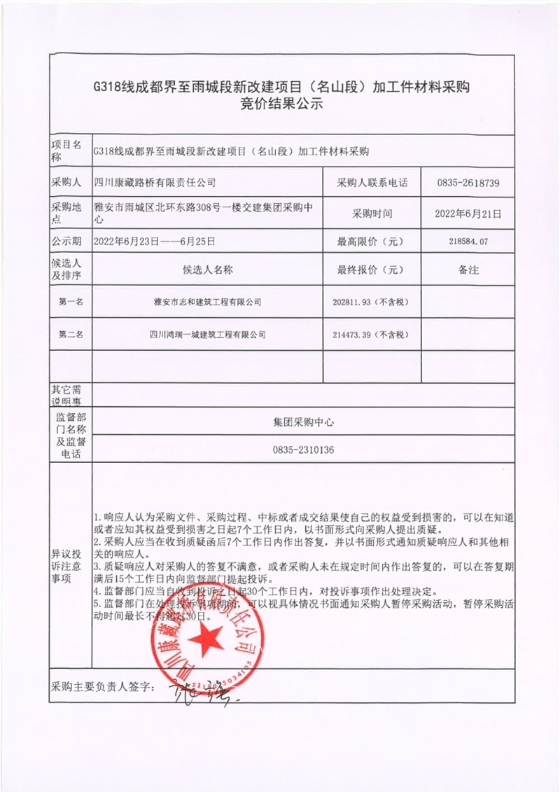 四川康藏路橋有限責(zé)任公司G318線(xiàn)成都界至雨城段新改建項(xiàng)目(名山段)加工件材料采購(gòu)競(jìng)價(jià)結(jié)果公示