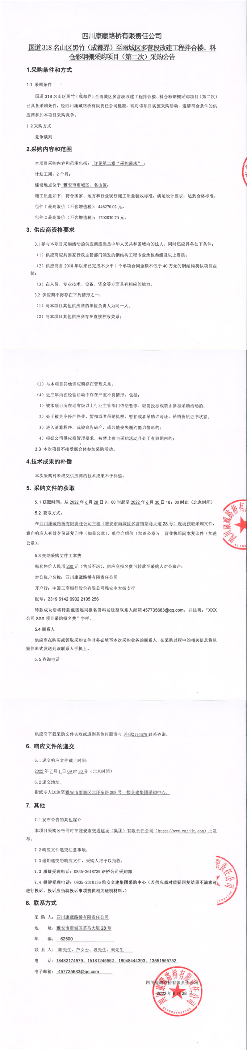 四川康藏路橋有限責任公司國道318名山區(qū)黑竹(成都界)至雨城區(qū)多營段改建工程拌合樓、料倉彩鋼棚采購項目(第二次)采購公告
