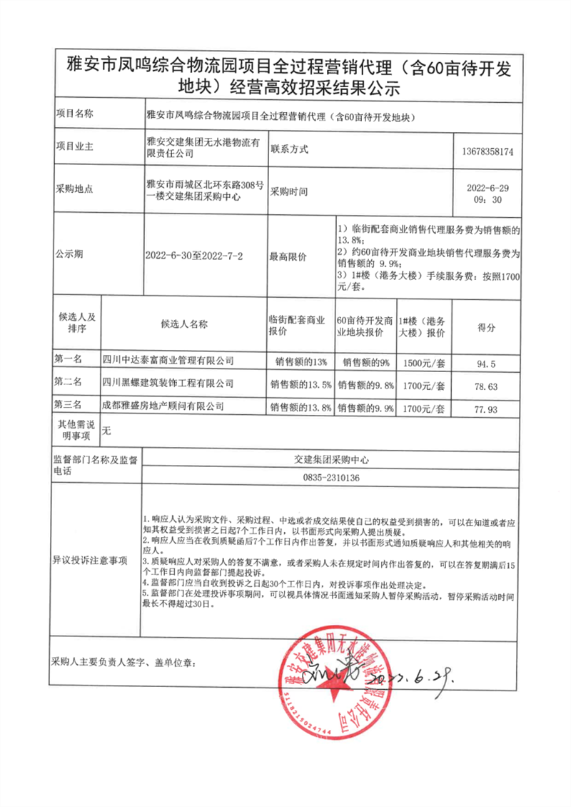 雅安交建集團無水港物流有限責任公司雅安市鳳鳴綜合物流園項目全過程營銷代理(含60畝待開發(fā)地塊)經(jīng)營高效招采結果公示