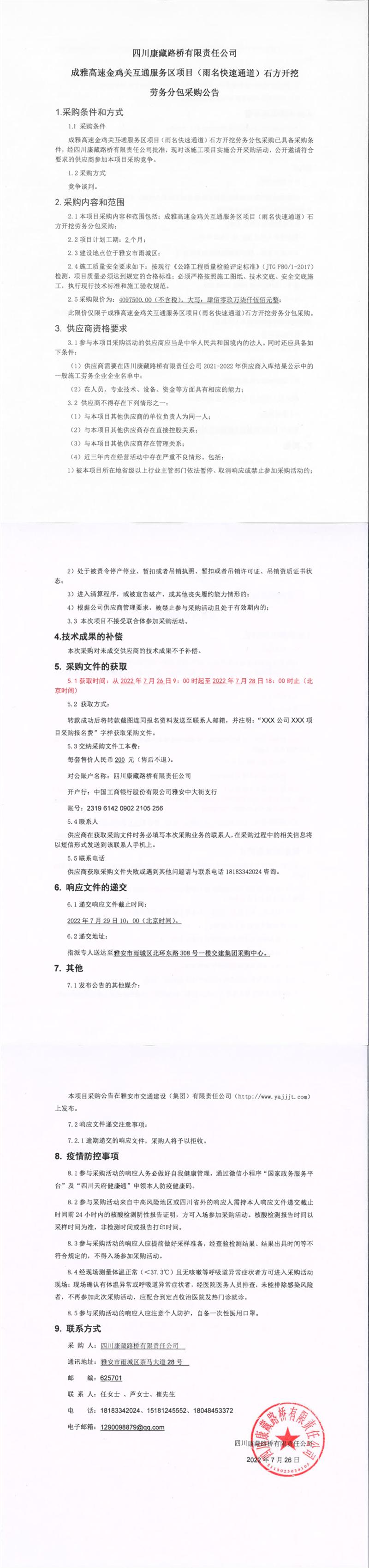 四川康藏路橋有限責(zé)任公司成雅高速金雞關(guān)互通及服務(wù)區(qū)項(xiàng)目(雨名快速通道)石方開挖勞務(wù)分包采購(gòu)公告