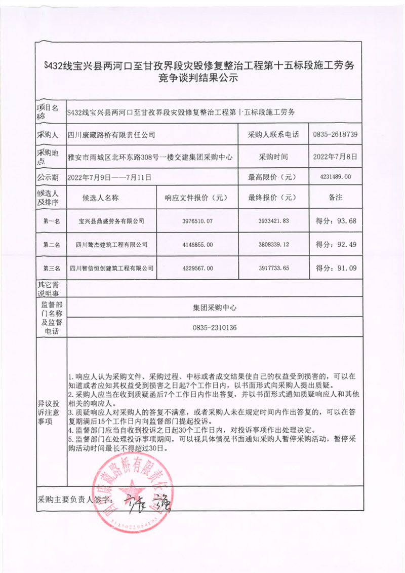 四川康藏路橋有限責任公司S432線寶興縣兩河口至甘孜界段災毀修復整治工程第十五標段施工勞務競爭談判結(jié)果公示