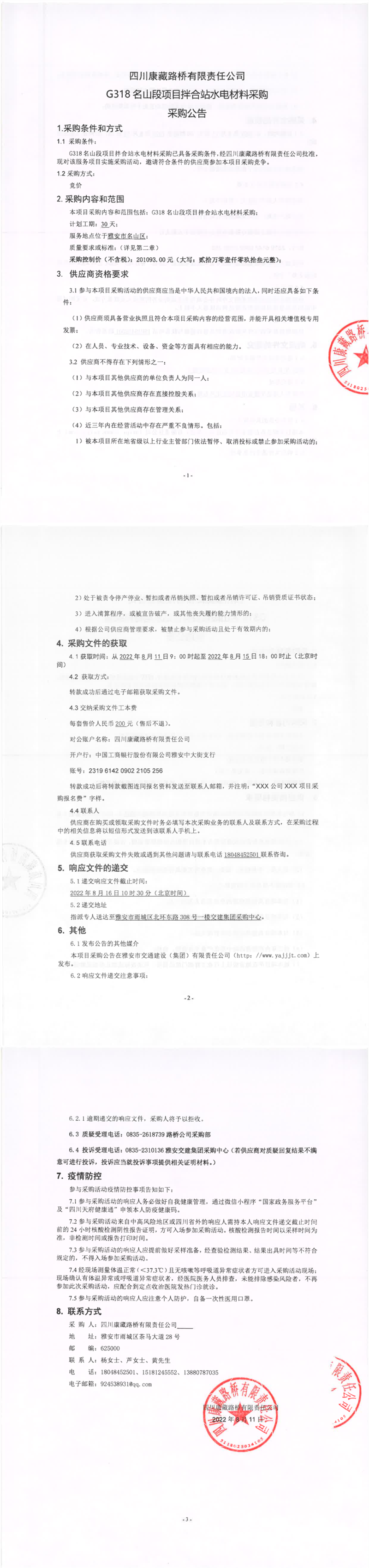 四川康藏路橋有限責(zé)任公司G318名山段項目拌合站水電材料采購采購公告