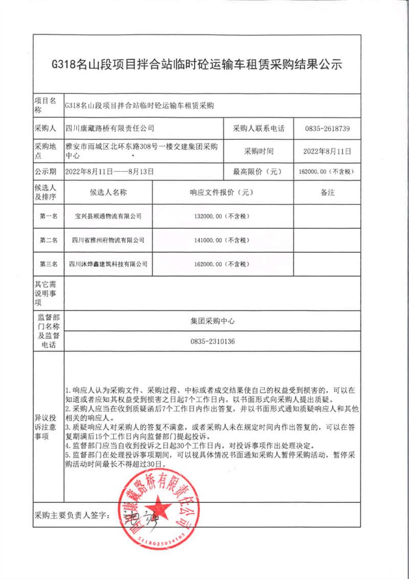 四川康藏路橋有限責任公司G318名山段項目拌合站臨時砼運輸車租賃采購結(jié)果公示