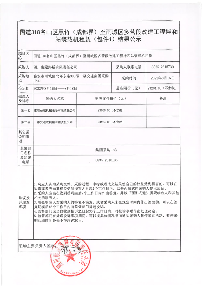 四川康藏路橋有限責任公司國道318名山區(qū)黑竹(成都界)至雨城區(qū)多營段改建工程拌和站裝載機租賃(包件1)結(jié)果公示