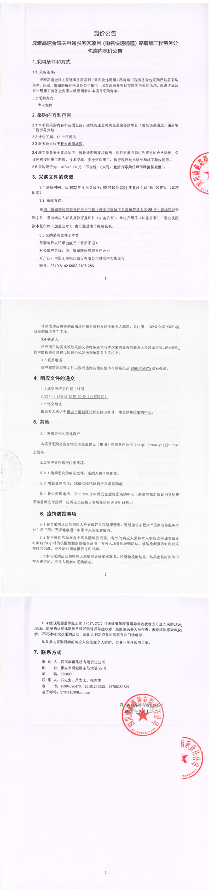四川康藏路橋有限責任公司成雅高速金雞關互通服務區(qū)項目(雨名快速通道)路肩墻工程勞務分包庫內(nèi)競價公告