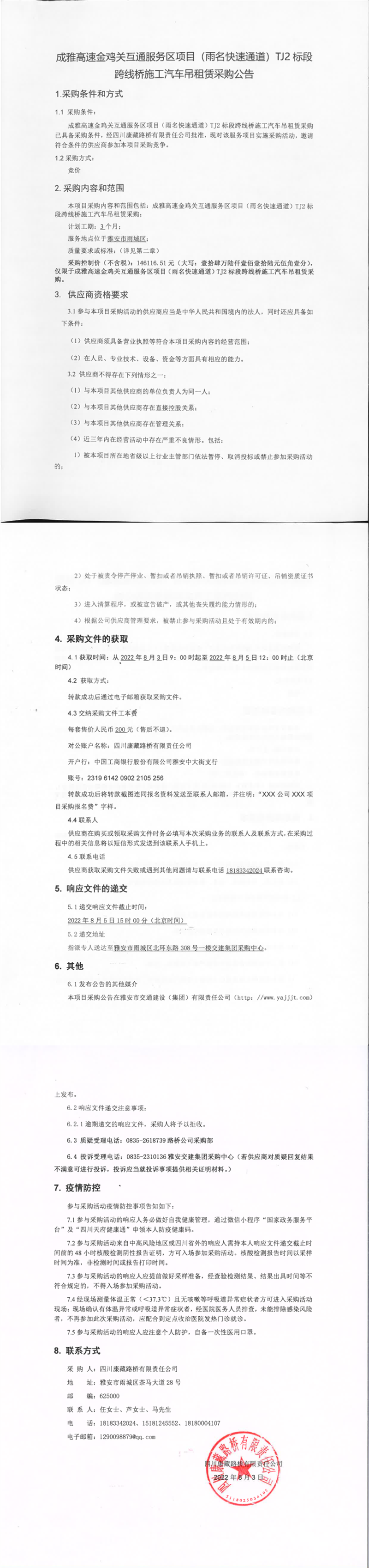 四川康藏路橋有限責(zé)任公司成雅高速金雞關(guān)互通服務(wù)區(qū)項(xiàng)目(雨名快速通道)TJ2標(biāo)段跨線橋施工汽車(chē)吊租賃采購(gòu)公告