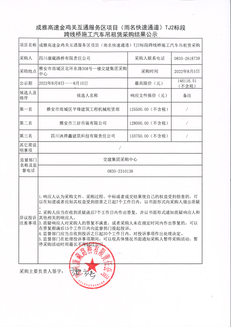 四川康藏路橋有限責任公司成雅高速金雞關互通服務區(qū)項目(雨名快速通道)TJ2標段跨線橋施工汽車吊租賃采購結果公示