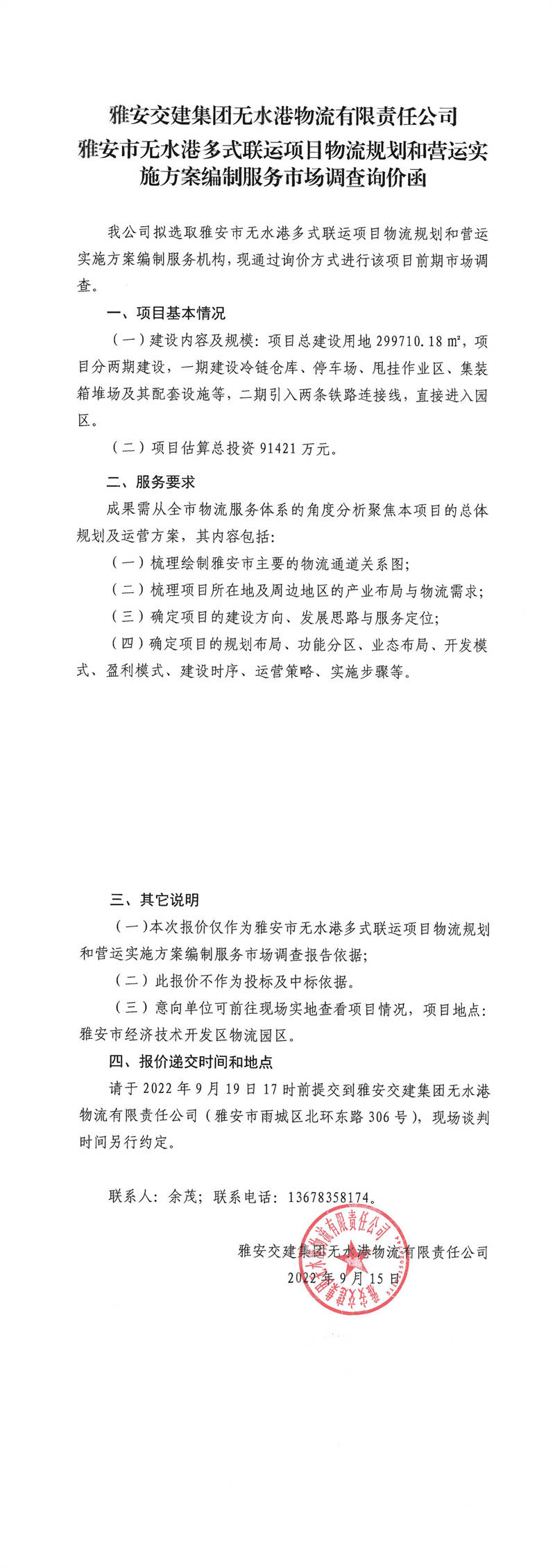 雅安交建集團(tuán)無水港物流有限責(zé)任公司雅安市無水港多式聯(lián)運(yùn)項(xiàng)目物流規(guī)劃和營運(yùn)實(shí)施方案編制服務(wù)市場調(diào)查詢價(jià)函