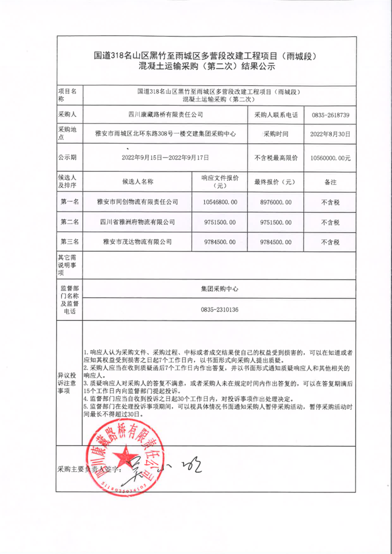 四川康藏路橋有限責(zé)任公司國道318名山區(qū)黑竹至雨城區(qū)多營段改建工程項(xiàng)目(雨城段)混凝土運(yùn)輸采購(第二次)結(jié)果公示