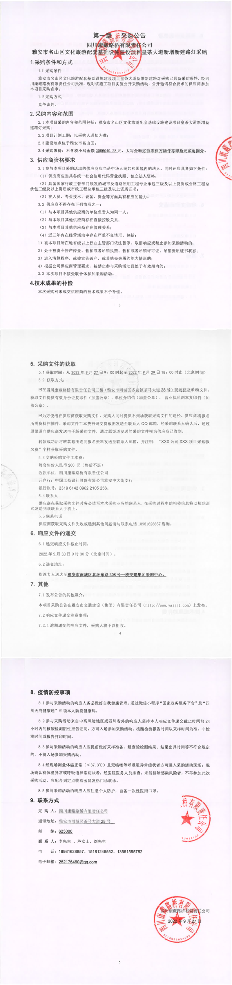 四川康藏路橋有限責任公司雅安市名山區(qū)文化旅游配套基礎(chǔ)設(shè)施建設(shè)項目皇茶大道新增新建路燈采購公告