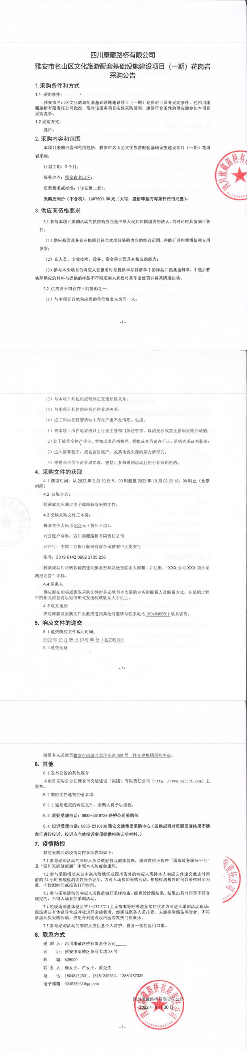 四川康藏路橋有限公司雅安市名山區(qū)文化旅游配套基礎(chǔ)設(shè)施建設(shè)項目(一期)花崗巖采購公告