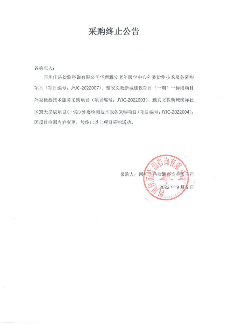 四川佳岳檢測(cè)咨詢有限公司采購(gòu)項(xiàng)目(項(xiàng)目編號(hào):JYJC-2022007、JYJC-2022003、JYJC-2022004)采購(gòu)中止公告