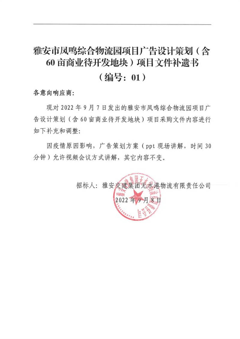 雅安交建集團(tuán)無水港物流有限責(zé)任公司雅安市鳳鳴綜合物流園項(xiàng)目廣告設(shè)計策劃(含60畝商業(yè)待開發(fā)地塊)項(xiàng)目文件補(bǔ)遺書(編號:01)