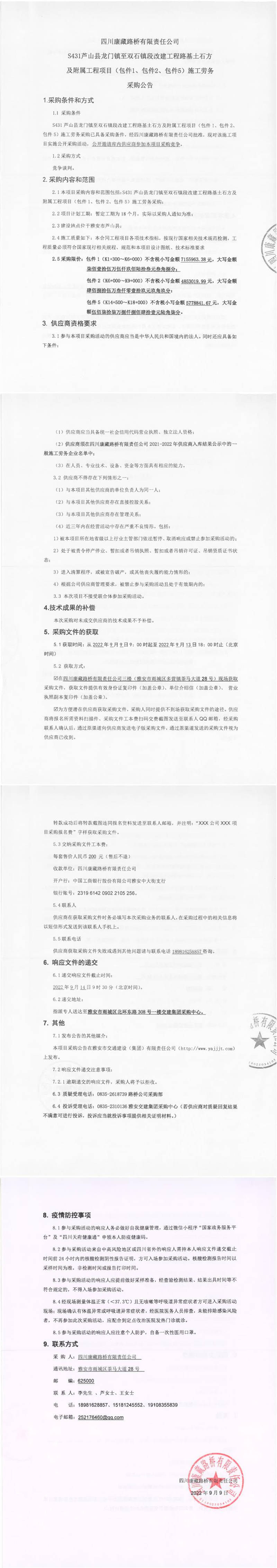 四川康藏路橋有限責任公司S431蘆山縣龍門鎮(zhèn)至雙石段改建工程路基土石方及附屬工程項目(包件1、包件2、包件5)施工勞務(wù)采購公告