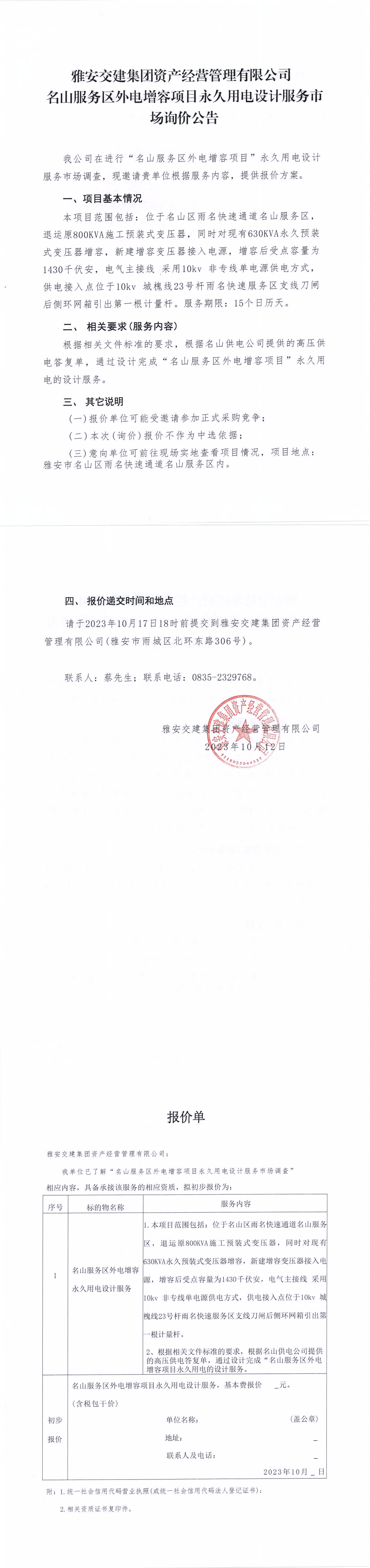 雅安交建集團(tuán)資產(chǎn)經(jīng)營(yíng)管理有限公司名山服務(wù)區(qū)外電增容項(xiàng)目永久用電設(shè)計(jì)服務(wù)市場(chǎng)詢價(jià)公告