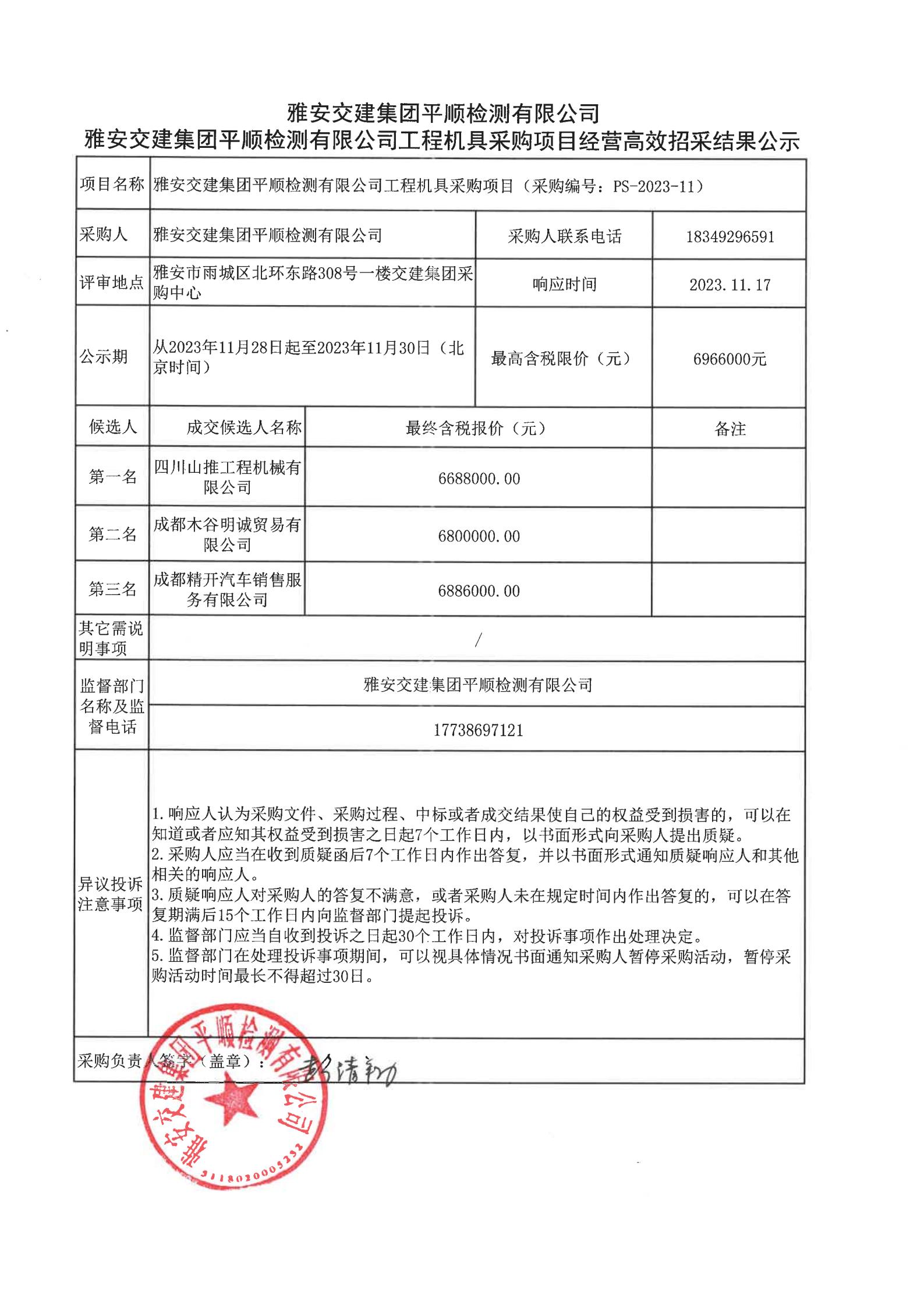 雅安交建集團平順檢測有限公司工程機具采購項目經(jīng)營高效招采結果公示