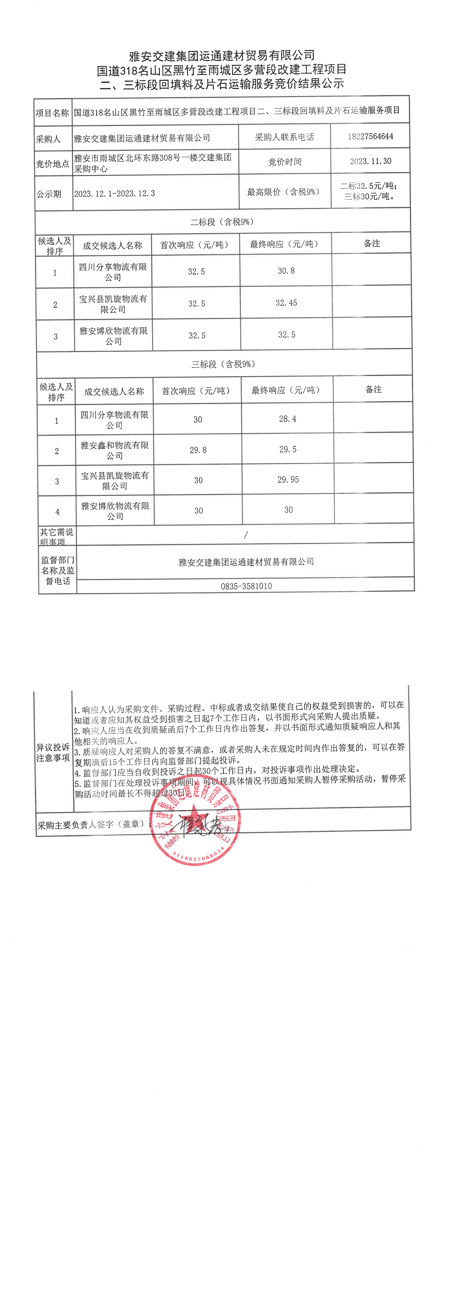 雅安交建集團運通建材貿(mào)易有限公司國道318名山區(qū)黑竹至雨城區(qū)多營段改建工程項目二、三標段回填料、片石運輸服務競價結果公示