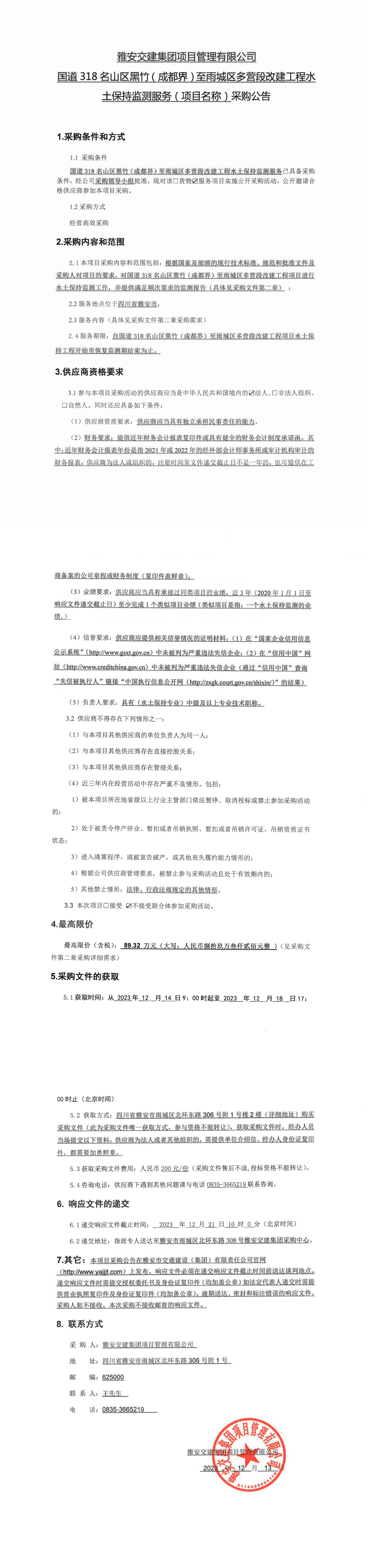 雅安交建集團(tuán)項(xiàng)目管理有限公司國(guó)道318名山區(qū)黑竹(成都界)至雨城區(qū)多營(yíng)段改建工程水土保持監(jiān)測(cè)服務(wù)(項(xiàng)目名稱)采購(gòu)公告