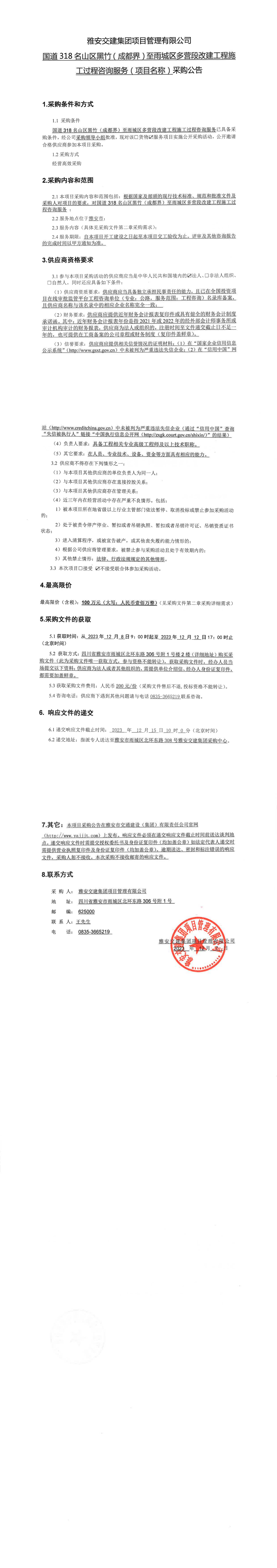 雅安交建集團(tuán)項(xiàng)目管理有限公司國(guó)道318名山區(qū)黑竹(成都界)至雨城區(qū)多營(yíng)段改建工程施工過(guò)程咨詢服務(wù)(項(xiàng)目名稱)采購(gòu)公告