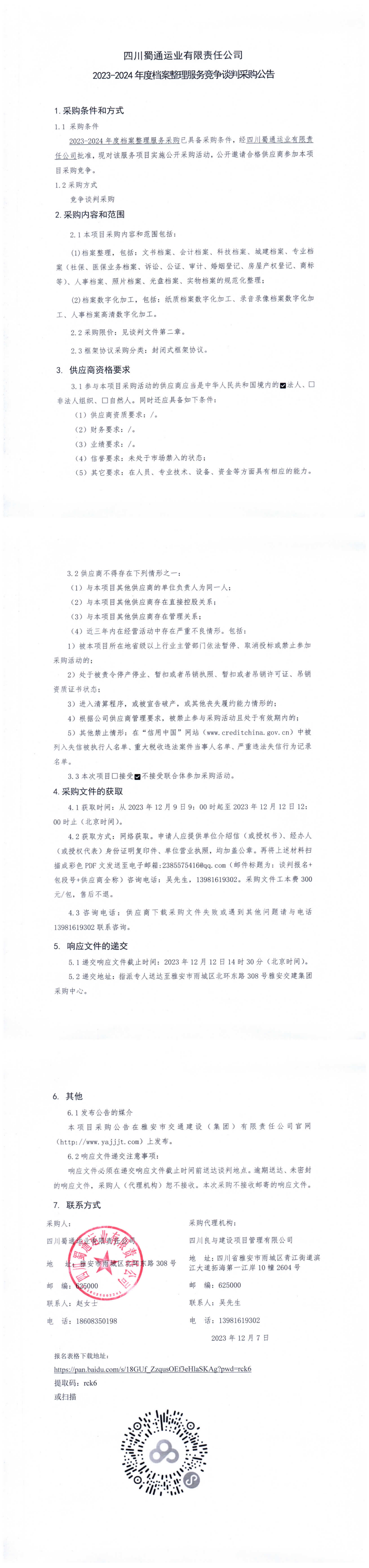 四川蜀通運業(yè)有限責任公司2023-2024年度檔案整理服務競爭談判采購公告