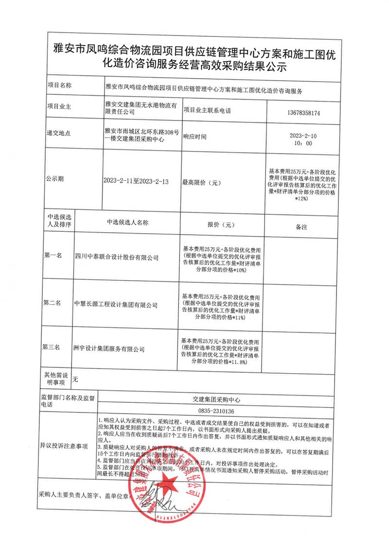 雅安交建集團無水港物流有限責任公司雅安市鳳鳴綜合物流園項目供應鏈管理中心方案和施工圖優(yōu)化造價咨詢服務經(jīng)營高效采購結果公示