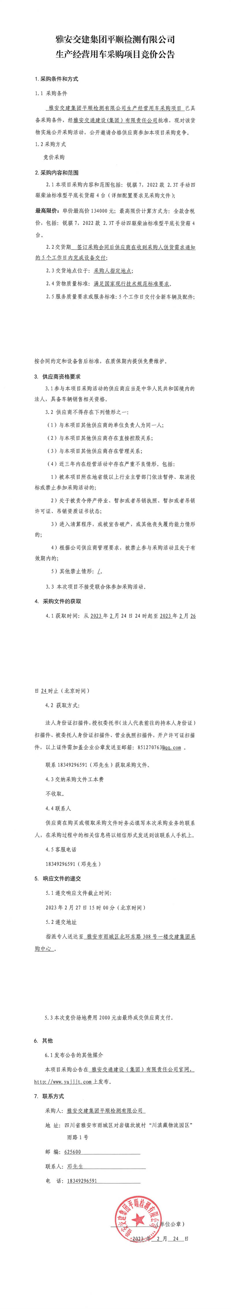 雅安交建集團(tuán)平順檢測有限公司生產(chǎn)經(jīng)營用車采購項目競價公告