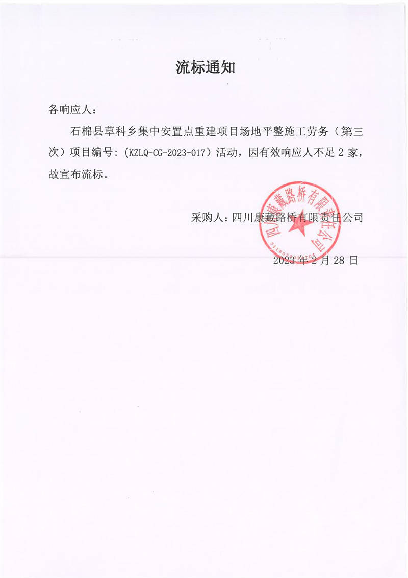 四川康藏路橋有限責(zé)任公司石棉草科鄉(xiāng)集中安置點(diǎn)重建項(xiàng)目場地平整施工勞務(wù)(第三次)庫內(nèi)競價(jià)流標(biāo)通知
