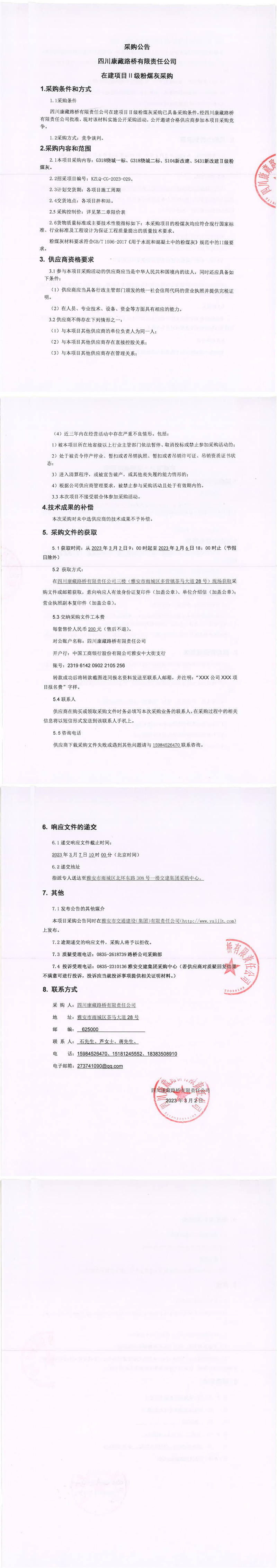 四川康藏路橋有限責(zé)任公司在建項(xiàng)目Ⅱ級(jí)粉煤灰采購(gòu)公告