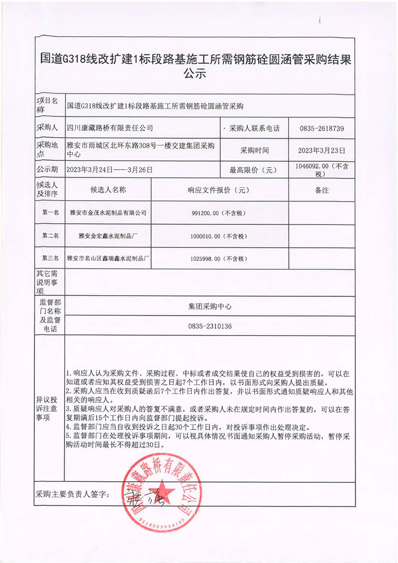 四川康藏路橋有限責(zé)任公司石國道G318擴(kuò)建1標(biāo)段路基施工所需鋼筋砼圓涵管采購結(jié)果公示