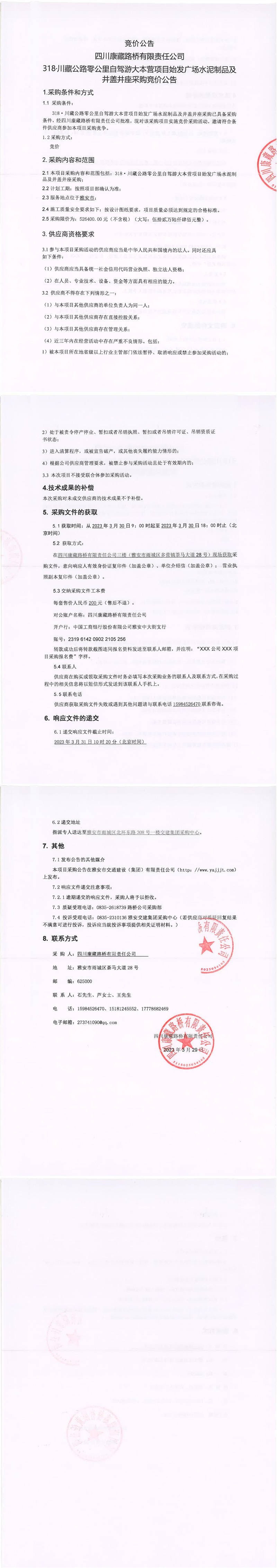 四川康藏路橋有限責(zé)任公司318·川藏公路零公里自駕游大本營(yíng)項(xiàng)目始發(fā)廣場(chǎng)水泥制品及井蓋井座采購(gòu)競(jìng)價(jià)公告