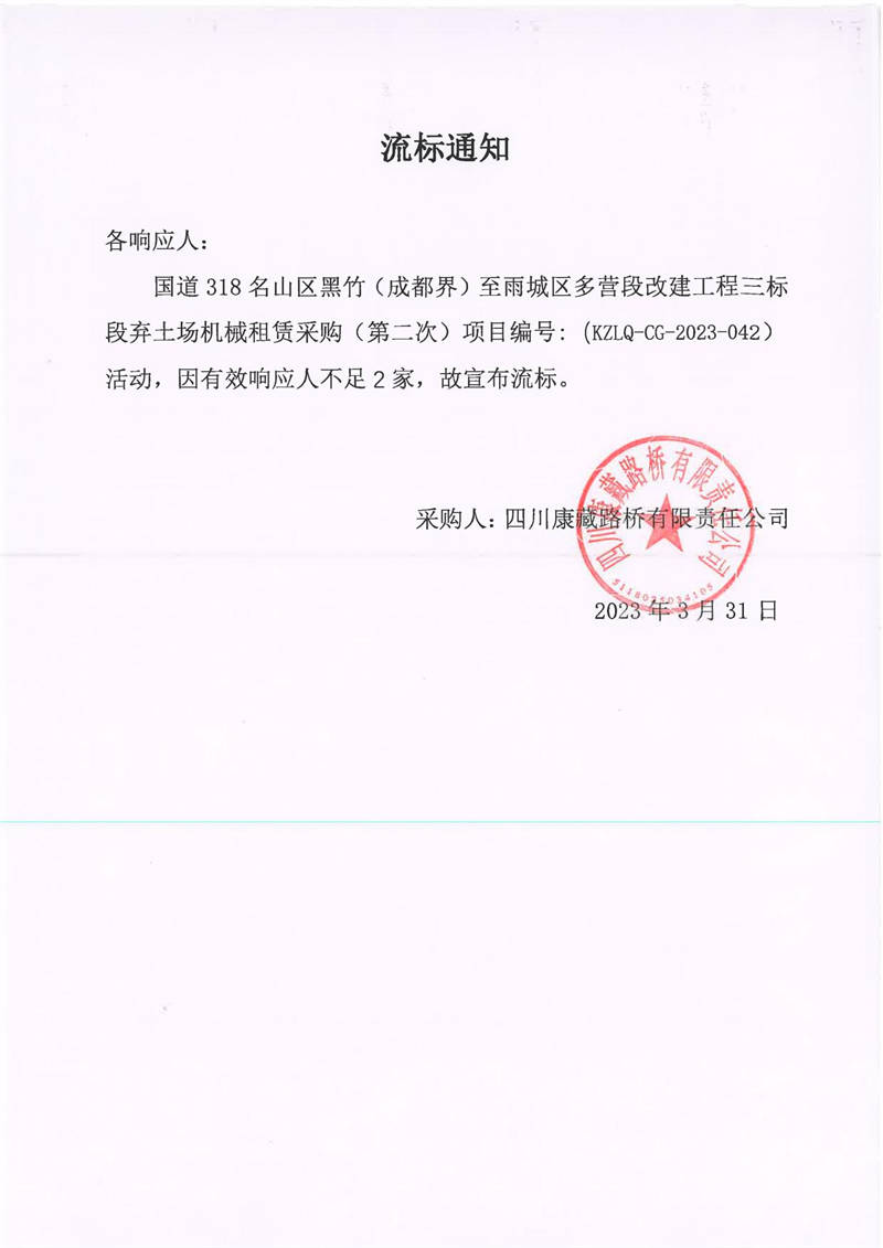 四川康藏路橋有限責(zé)任公司國(guó)道318名山區(qū)黑竹(成都界)至雨城區(qū)多營(yíng)段改建工程三標(biāo)段棄土場(chǎng)機(jī)械租賃采購(gòu)流標(biāo)通知