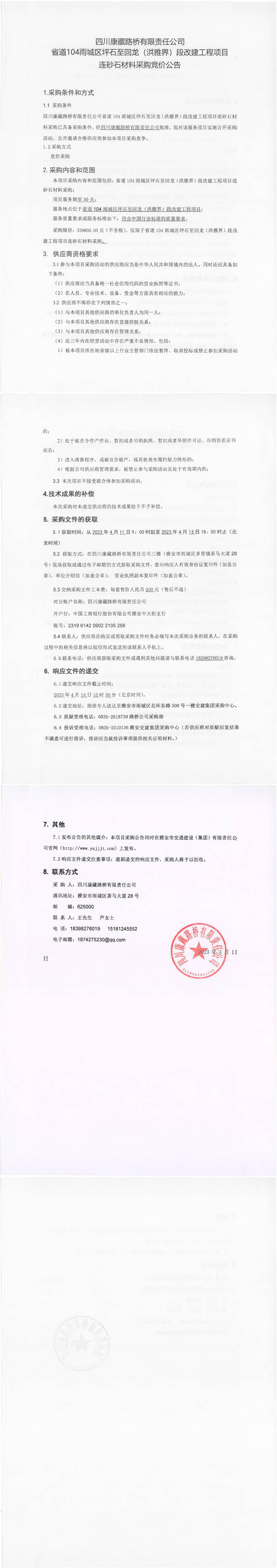 四川康藏路橋有限責(zé)任公司省道104雨城區(qū)坪石至回龍(洪雅界)段改建工程項(xiàng)目連砂石材料采購競(jìng)價(jià)公告