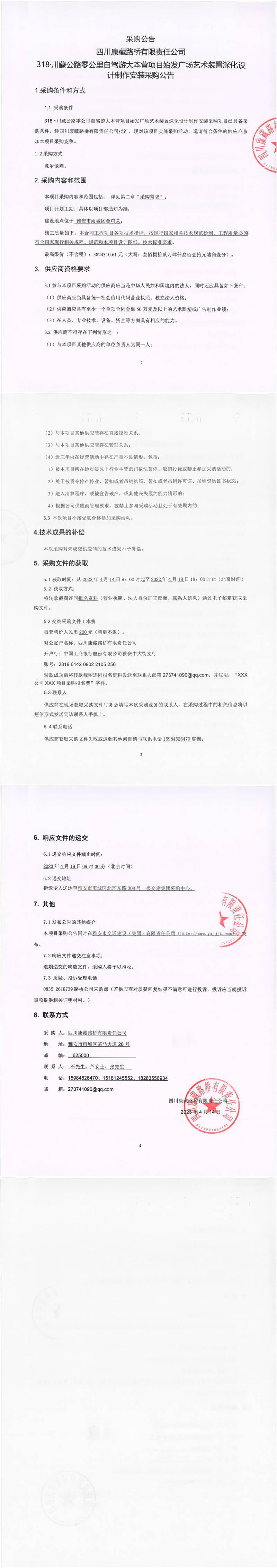 四川康藏路橋有限責(zé)任公司318·川藏公路零公里自駕游大本營項目始發(fā)廣場藝術(shù)裝置深化設(shè)計制作安裝采購公告